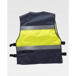 Gilet multipoches réglable en tissu Oxford avec réglages sur les côtés, combiné et avec bandes réfléchissantes. Col V et fermeture éclair en nylon. Une poche avec fermeture éclair verticale et une poche plaquée à rabat en scratch sur la poitrine. Système de soutien spécial radios. Deux poches latérales avec bande réfléchissante, à soufflet et fermeture à zip. Poche arrière à fermeture éclair. Boucles réglables sur les côtés. Deux bandes réfléchissantes sur la poitrine et dans le dos avec pièce centrale en haute visibilité. Finition par biais contrastés. Doublure intérieure en maille.