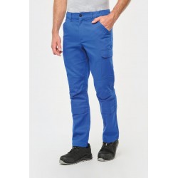 2 poches devant (sacs de poches en tissu principal), 1 poche à rabat avec fermeture velcro côté gauche au porté, 1 double poche outil ouverte à droite au porté, 2 poches plaquées arrière, 2 poches genouillères ton sur ton avec velcro et rabat intérieur pour maintenir et adapter la genouillère