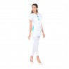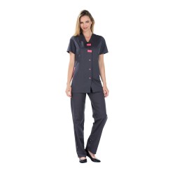 Tunique manches courtes, poches côtés dans les coutures, fentes côtés, fermeture par pressions, longueur 75cm.