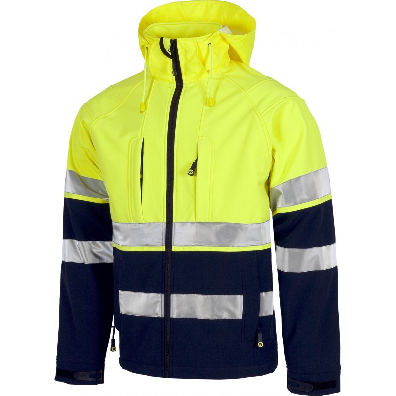 Veste Softshell combinée avec bandes réfléchissantes. Partie supérieure en haute visibilité. Col montant et capuche détachable et réglable par cordon. Fermeture à zip en nylon. Rabat protecteur intérieur sur la partie supérieure couvrant la fermeture éclair. Deux poches poitrine et deux latérales intérieures avec fermeture éclair en nylon. Deux bandes réfléchissantes à la poitrine, au dos et sur les manches. Manche raglan et poignets réglables en scratch. Coupes décoratives. Cordon élastique avec pièce réglable sur le bas. Tissu coupe-vent, résistant à l'eau et aux accros avec membrane intérieure respirable et isolante et revêtement intérieur de haute capacité thermique.